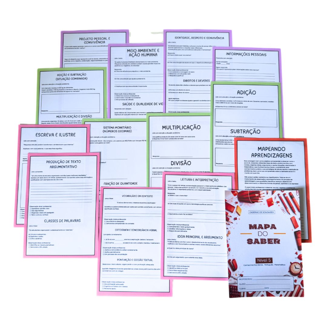 O Mapa do Saber – Caderno de Sondagem (5º ano) foi elaborado para identificar os conhecimentos prévios dos alunos que estão concluindo os anos iniciais do Ensino Fundamental, considerando leitura crítica, produção textual, argumentação e resolução de situações matemáticas mais elaboradas.